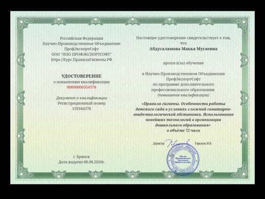 Наши воспитатели прошли онлайн курс повышения квалификации на тему «Правила гигиены. Особенности работы детского сада в условиях сложной санитарно-эпидемиологической обстановки. Использование новейших технологий в организации дошкольного образования»